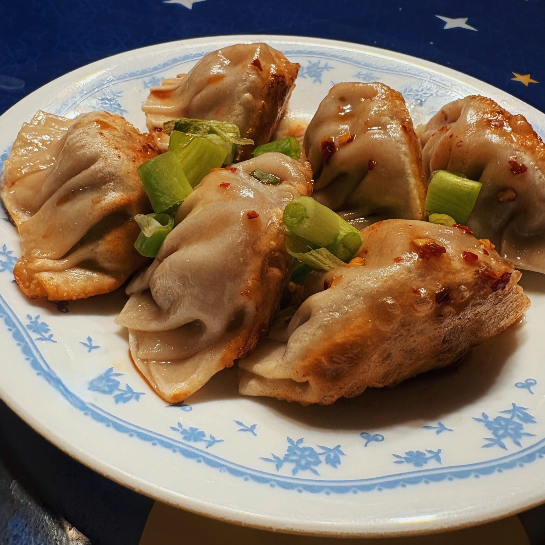 - Heat oil in a shallow frying pan on high heat and place dumplings into the pan, flat side down. Fry dumplings till the base is golden brown. Then, using a lid as a shield, pour a small splash of water into the pan until the base of the dumplings are covered. Cover quickly with lid and steam for 5-8 mins on medium heat until all water has evaporated. Once the pan is completely dry of water, allow dumplings to crisp up on the bottom for a further minute.